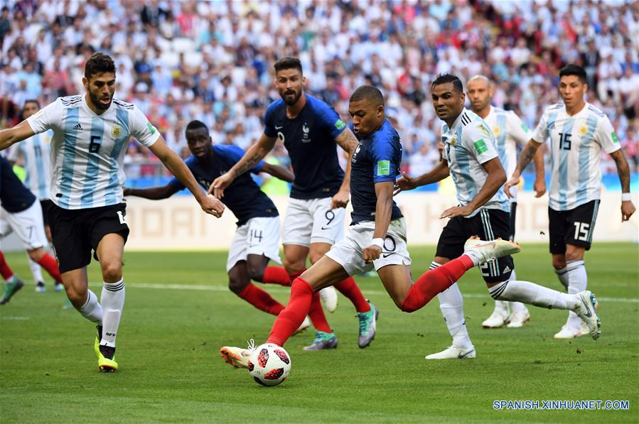 El jugador Kylian Mbappe (frente), de Francia, realiza una anotación durante el partido de octavos de final de la Copa Mundial de la FIFA Rusia 2018, ante Argentina, en Kazán, Rusia, el 30 de junio de 2018. (Xinhua/Li Ga)