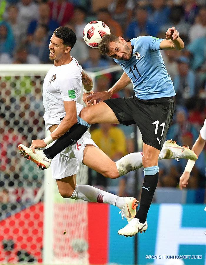 El jugador Cristhian Stuani (d), de Uruguay, disputa el balón con José Fonte (i), de Portugal, durante el partido de octavos de final de la Copa Mundial de la FIFA Rusia 2018, en Sochi, Rusia, el 30 de junio de 2018. (Xinhua/Liu Dawei)
