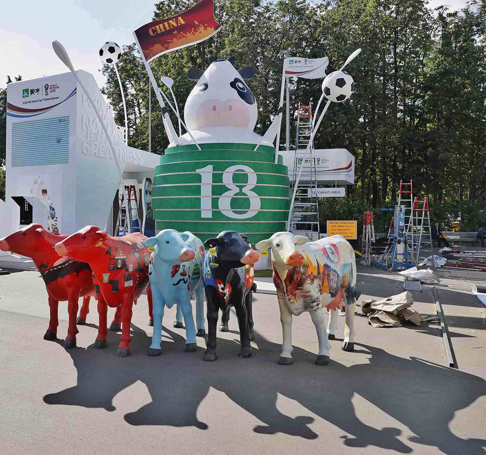 El stand de Mengniu, un productor lechero de la región autónoma de Mongolia interior, preside la entrada de una de las sedes de la Copa Mundial de Fútbol Rusia 2018. Mengniu es una de las siete empresas chinas que patrocinan el torneo.