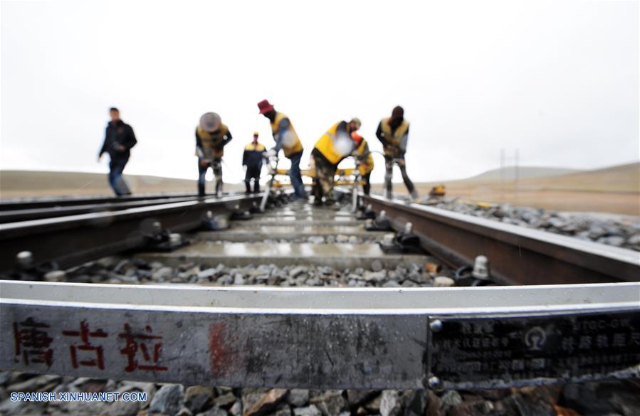QINGHAI, julio 1, 2018 (Xinhua) -- Imagen del 30 de junio de 2018 de trabajadores reforzando una vía bajo la lluvia cerca de la Estación Tanggula de la vía férrea Qinghai-Tíbet, provincia de Qinghai, en el noroeste de China. Trabajadores de mantenimiento permanecen en sus puestos todos los días para garantizar la operación de la vía férrea Qinghai-Tíbet, en la Estación Tanggula, con una altitud de 5,072 metros sobre el nivel del mar. (Xinhua/Hou Deqiang)