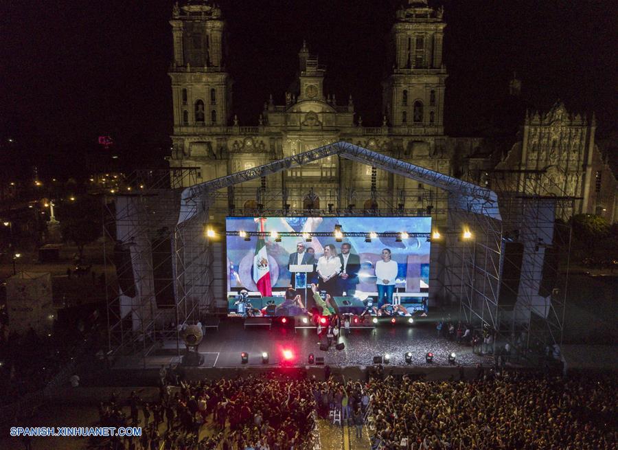 CIUDAD DE MEXICO, julio 2, 2018 (Xinhua) -- Imagen tomada con un dron de simpatizantes del candidato a la Presidencia de México por la coalición "Juntos Haremos Historia", Andrés Manuel López Obrador, festejando su triunfo en las elecciones presidenciales en el Zócalo de la Ciudad de México, capital de México, el 2 de julio de 2018. El candidato de la coalición "Juntos haremos historia", Andrés Manuel López Obrador, convocó el domingo a la reconciliación a los ciudadanos mexicanos, tras los resultados preliminares que apuntan a su virtual triunfo de las elecciones presidenciales. (Xinhua/César Vicu?a)