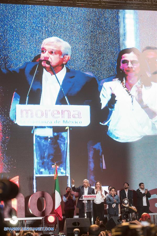 CIUDAD DE MEXICO, julio 2, 2018 (Xinhua) -- El candidato a la Presidencia de México por la coalición "Juntos Haremos Historia", Andrés Manuel López Obrador (i-frente), pronuncia un discurso junto a su esposa, Beatriz Gutiérrez Mueller (4-d), en el Zócalo de la Ciudad de México, capital de México, el 2 de julio de 2018. El candidato de la coalición "Juntos haremos historia", Andrés Manuel López Obrador, convocó el domingo a la reconciliación a los ciudadanos mexicanos, tras los resultados preliminares que apuntan a su virtual triunfo de las elecciones presidenciales. (Xinhua/Alejandro Meléndez)