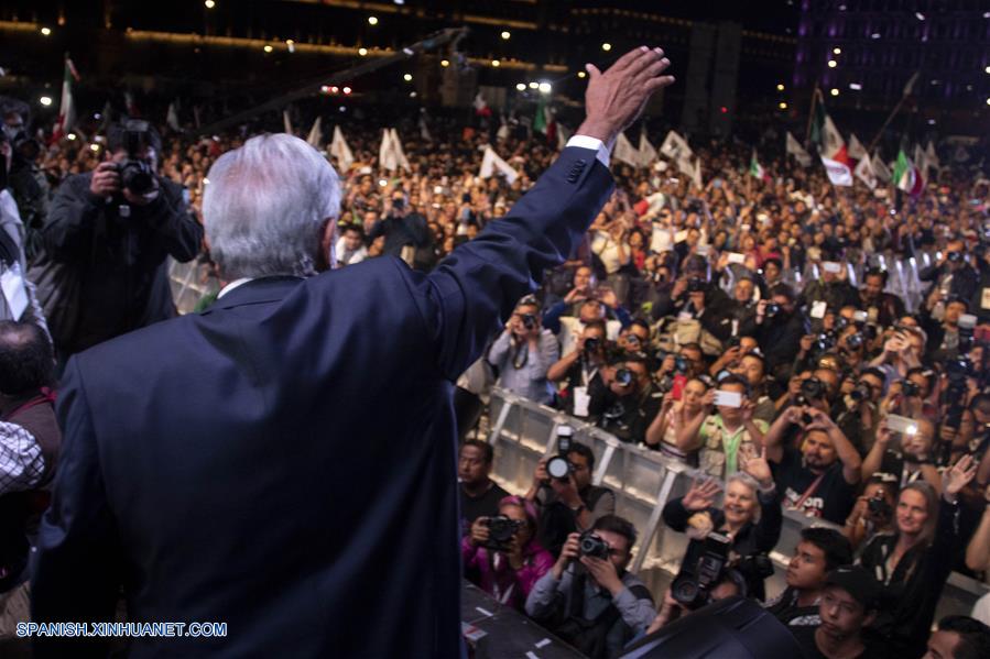 CIUDAD DE MEXICO, julio 2, 2018 (Xinhua) -- El candidato a la Presidencia de México por la coalición "Juntos Haremos Historia", Andrés Manuel López Obrador, reacciona en el Zócalo de la Ciudad de México, capital de México, el 2 de julio de 2018. El candidato de la coalición "Juntos haremos historia", Andrés Manuel López Obrador, convocó el domingo a la reconciliación a los ciudadanos mexicanos, tras los resultados preliminares que apuntan a su virtual triunfo de las elecciones presidenciales. (Xinhua/Alejandro Ayala)