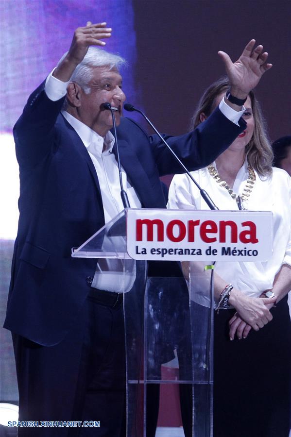 CIUDAD DE MEXICO, julio 2, 2018 (Xinhua) -- El candidato a la Presidencia de México por la coalición "Juntos Haremos Historia", Andrés Manuel López Obrador (i), pronuncia un discurso junto a su esposa Beatriz Gutiérrez Mueller (d) en el Zócalo de la Ciudad de México, capital de México, el 2 de julio de 2018. El candidato de la coalición "Juntos haremos historia", Andrés Manuel López Obrador, convocó el domingo a la reconciliación a los ciudadanos mexicanos, tras los resultados preliminares que apuntan a su virtual triunfo de las elecciones presidenciales. (Xinhua/Ricardo Aldayturriaga)
