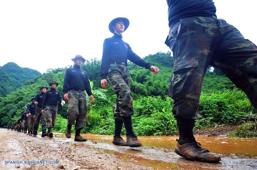 CHIANG RAI, julio 2, 2018 (Xinhua) -- Rescatistas se dirigen a un complejo de cuevas donde 12 adolescentes y su entrenador de fútbol desaparecieron en Mae Sai, provincia de Chiang Rai, en el norte de Tailandia, el 2 de julio de 2018. Trece personas atrapadas en una cueva en Tailandia fueron halladas con vida, informó la noche del lunes el gobernador de Chiang Rai. (Xinhua/Rachen Sageamsak)