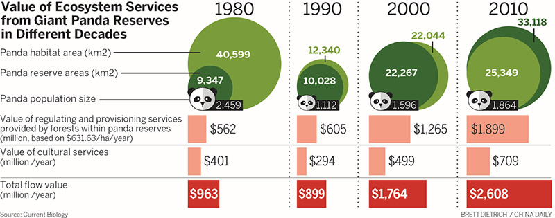"Muchos detractores han argumentado que gastar recursos valiosos en la conservación del panda es un desperdicio", dijo el autor principal del estudio Wei Fuwen de la Academia de Ciencias de China. "Nuestro análisis contradice esta visión y demuestra claramente el gran valor del panda, tanto por su valor cultural e intrínseco, como por los servicios ecosistémicos proporcionados por las reservas de pandas".