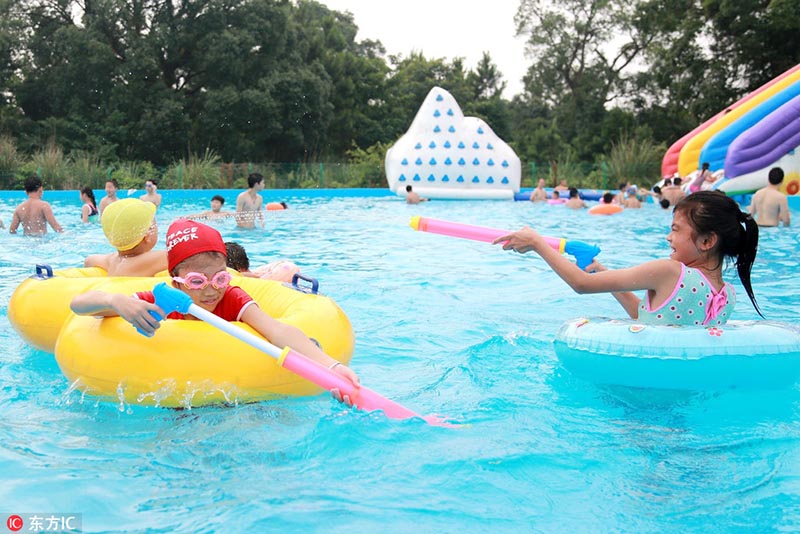 Los ni?os juegan con pistolas de agua en un parque acuático en el condado Xiajiang, provincia de Jiangxi en el este de China, el 1 de julio de 2018. [Foto / IC]