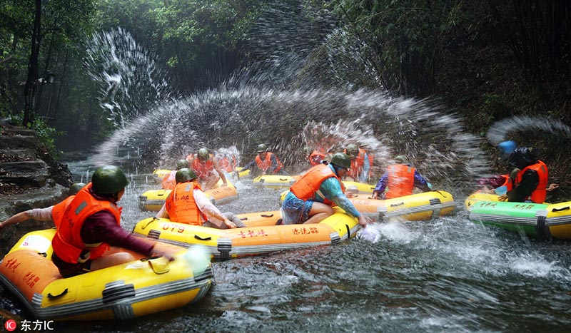 Beijing, 03/07/2018(El Pueblo en Línea) - Una multitud de turistas se divierten haciendo rafting en balsas inflables en el valle Gulong de la ciudad de Qingyuan, provincia de Guangdong, sur de China, el 1 de julio de 2018. El rafting se ha convertido en un gran éxito debido al calor abrasador. [Foto / IC]