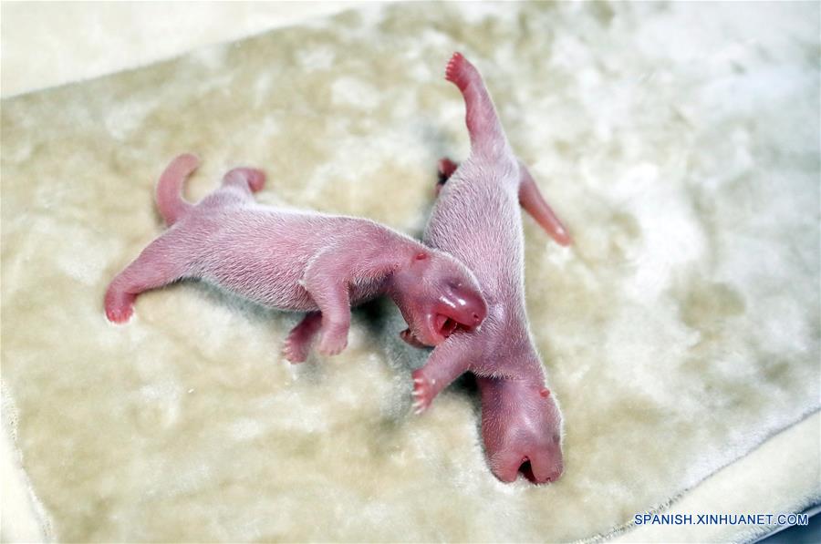Dos crías gemelas, una hembra y un macho, de oso panda permanecen en la Base de Investigación para la Cría del Panda Gigante de Chengdu, provincia de Sichuan, en el suroeste de China, el 2 de julio de 2018. Dos crías gemelas, una hembra y un macho, de oso panda nacieron el lunes por la ma?ana en la provincia de Sichuan en el suroeste de China. (Xinhua/Str)