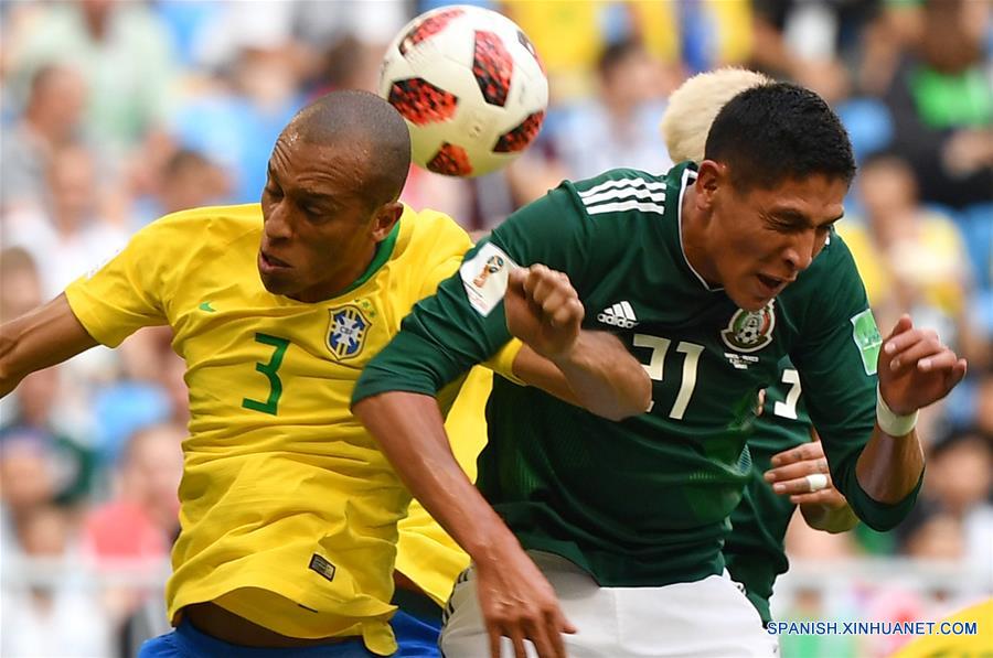 El jugador Miranda (i), de Brasil, disputa el balón con Edson Alvarez (d), de México, durante el partido de octavos de final de la Copa Mundial de la FIFA Rusia 2018, en Samara, Rusia, el 2 de julio de 2018. (Xinhua/Li Ga)