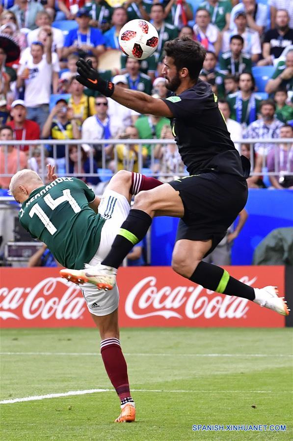 El guardameta Alisson (d), de Brasil, disputa el balón con Javier Hernández (i), de México, durante el partido de octavos de final de la Copa Mundial de la FIFA Rusia 2018, en Samara, Rusia, el 2 de julio de 2018. (Xinhua/Chen Yichen)
