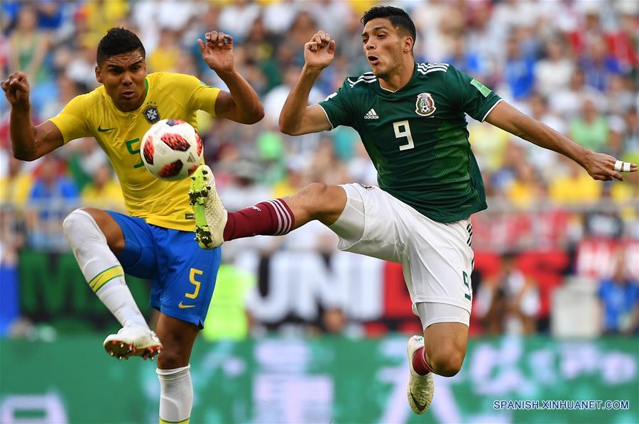 El jugador Casemiro (i), de Brasil, disputa el balón con Raúl Jiménez (d), de México, durante el partido de octavos de final de la Copa Mundial de la FIFA Rusia 2018, en Samara, Rusia, el 2 de julio de 2018. (Xinhua/Li Ga)