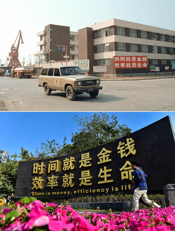 La parte superior (archivo) es una foto tomada por Xu Youzhu que muestra un edificio de oficinas de la zona industrial de Shekou en Shenzhen, provincia de Guangdong. La foto inferior tomada por Mao Siqian el 24 de febrero del 2015 muestra a un hombre que pasa por una plaza en Shekou, Shenzhen. Este a?o se conmemora el 40 aniversario de la política de reforma y apertura de China. En las últimas cuatro décadas, Shenzhen se ha desarrollado desde su condición de peque?o puerto pesquero hasta convertirse en una metrópolis global. (Foto: Xinhua)