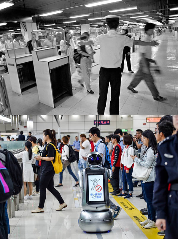 Shenzhen, 03/07/2018(El Pueblo en Línea) - La parte superior (archivo) es una foto tomada por Chen Xiaobo que muestra a los pasajeros en el puerto de Luohu de Shenzhen, provincia de Guangdong. La foto inferior tomada por Mao Siqian el 6 de abril del 2018 muestra un robot en el puerto de la bahía de Shenzhen. Este a?o se conmemora el 40 aniversario de la política de reforma y apertura de China. En las últimas cuatro décadas, Shenzhen se ha desarrollado desde su condición de peque?o puerto pesquero hasta convertirse en una metrópolis global. (Foto: Xinhua)