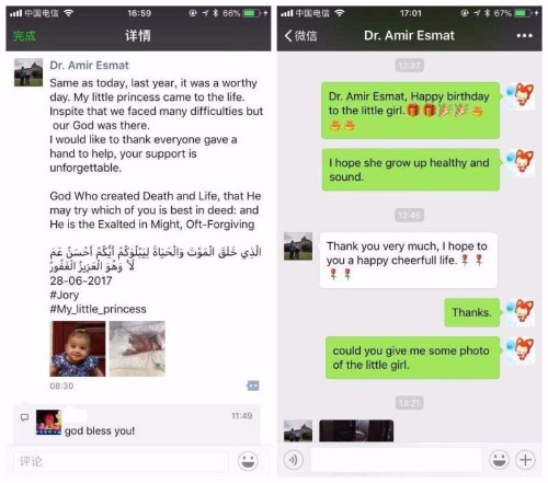 En junio del a?o pasado, Amir se encontraba en China como estudiante extranjero. Su esposa, que estaba embarazada, vino a visitarlo. El 28 de junio del 2017, una infección bacteriana provocó que su esposa diera a luz con una gestación de 25 semanas. Los médicos del hospital de Hubei lograron que la ni?a naciera viva.