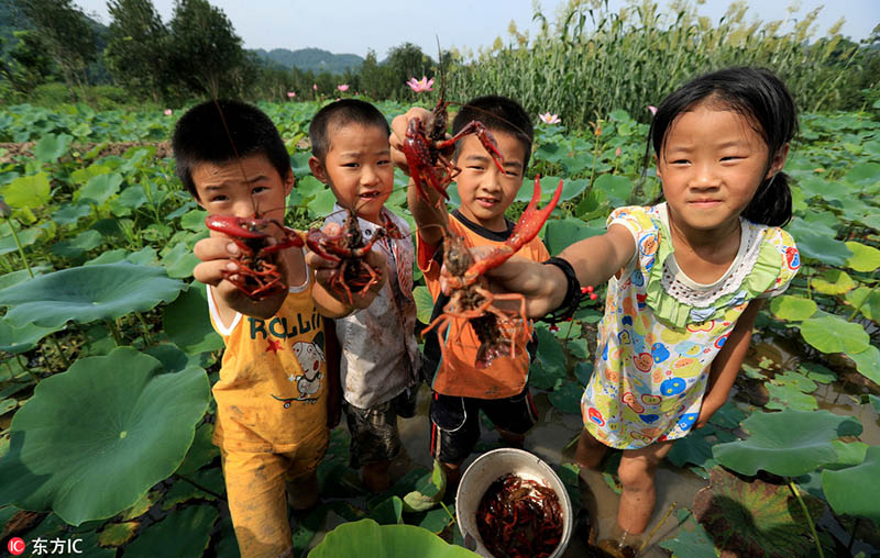 Ni?os capturan peces y langostas en un estanque de lotos en Luzhou, provincia de Sichuan, 2 de julio del 2018. [Foto: IC]