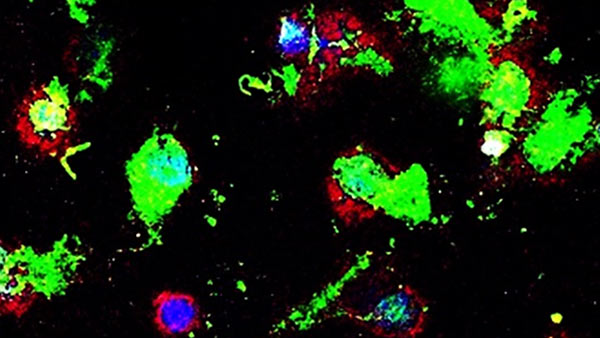 Imágenes microscópicas confocales que muestran macrófagos (rojo) que envuelven cáncer celdas (verde). - Ashish Kulkarni, Brigham and Women's Hospital