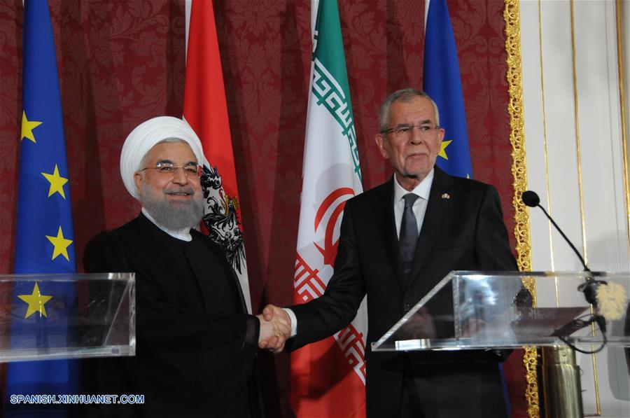 El presidente de Austria, Alexander Van der Bellen (d) estrecha la mano de su homólogo de Irán, Hassan Rouhani (i) durante una conferencia de prensa en Viena, Austria, el 4 de julio de 2018. El presidente de Irán, Hassan Rouhani, quien se encuentra de visita en Viena, dijo el miércoles que nadie saldrá beneficiado con la retirada de Estados Unidos del acuerdo nuclear. (Xinhua/Liu Xang)