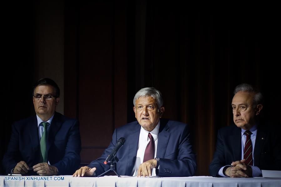 CIUDAD DE MEXICO, julio 5, 2018 (Xinhua) -- El virtual ganador de la elección presidencial en México, Andrés Manuel López Obrador (c), acompa?ado por Marcelo Ebrard (i) y Héctor Vasconcelos (d), participa en una conferencia de prensa, en la Ciudad de México, capital de México, el 5 de julio de 2018. El virtual ganador de la elección presidencial en México, Andrés Manuel López Obrador, anunció el jueves cambios en su futuro gabinete, en el que propuso al político Marcelo Ebrard como canciller, en lugar de Héctor Vasconcelos. Sobre los nombramientos de los secretarios de Defensa y Armada de México, el virtual presidente dijo que serán nombrados de acuerdo con la tradición, dejando en claro que no serán civiles, sino militares. (Xinhua/Francisco Ca?edo)
