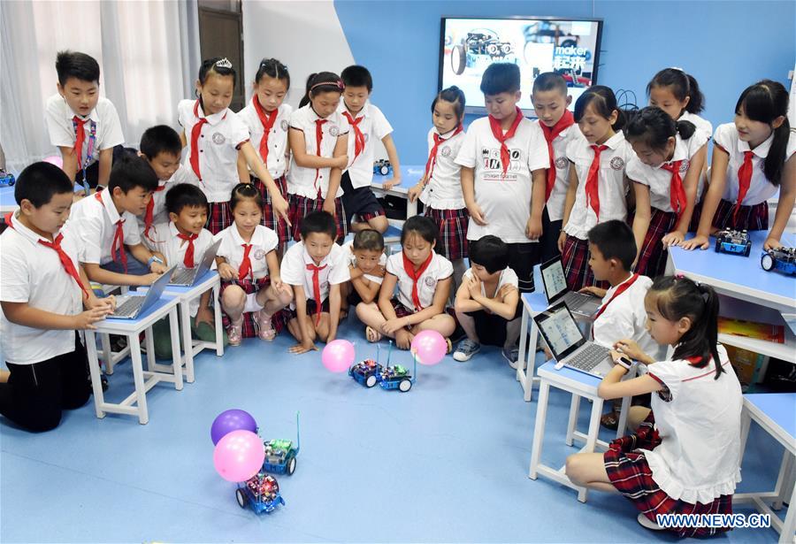 Hefei, 06/07/2018(El Pueblo en Línea) -El 4 de julio de 2018 tuvo lugar una competencia de robots en la escuela primaria Zhongming en el distrito Yi'an de Tongling, provincia de Anhui, este de China. Los ni?os participan en diversas actividades durante las vacaciones de verano. (Xinhua / Guo Shining)