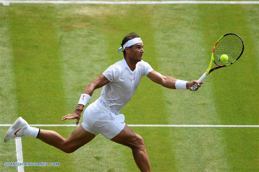 LONDRES, julio 5, 2018 (Xinhua) -- Rafael Nadal, de Espa?a, devuelve la pelota a Mikhail Kukushkin, de Kazajistán, durante el partido individual varonil de segunda ronda del Campeonato de Wimbledon 2018, en Londres, Reino Unido, el 5 de julio de 2018. Rafael Nadal ganó el encuentro. (Xinhua/Guo Qiuda)