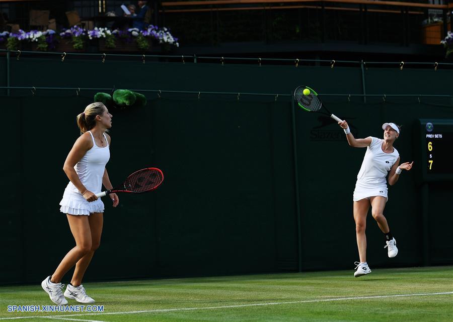 LONDRES, julio 4, 2018 (Xinhua) -- Olga Savchuk (i), de Ucrania y Alison Riske (d) de Estados Unidos, compiten durante el partido de dobles femenil de primera ronda del Campeonato de Wimbledon 2018, ante Xu Yifan de China, y Gabriela Dabrowski de Canadá, en Londres, Reino Unido, el 4 de julio de 2018. (Xinhua/Guo Qiuda)