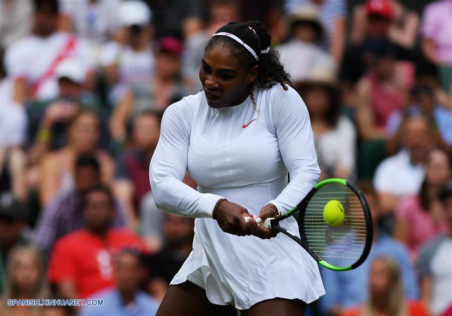 LONDRES, julio 4, 2018 (Xinhua) -- Serena Williams de Estados Unidos, devuelve la pelota durante el partido individual femenil de segunda ronda del Campeonato de Wimbledon 2018, ante Viktoriya Tomova, de Bulgaria, en Londres, Reino Unido, el 4 de julio de 2018. (Xinhua/Tang Shi)