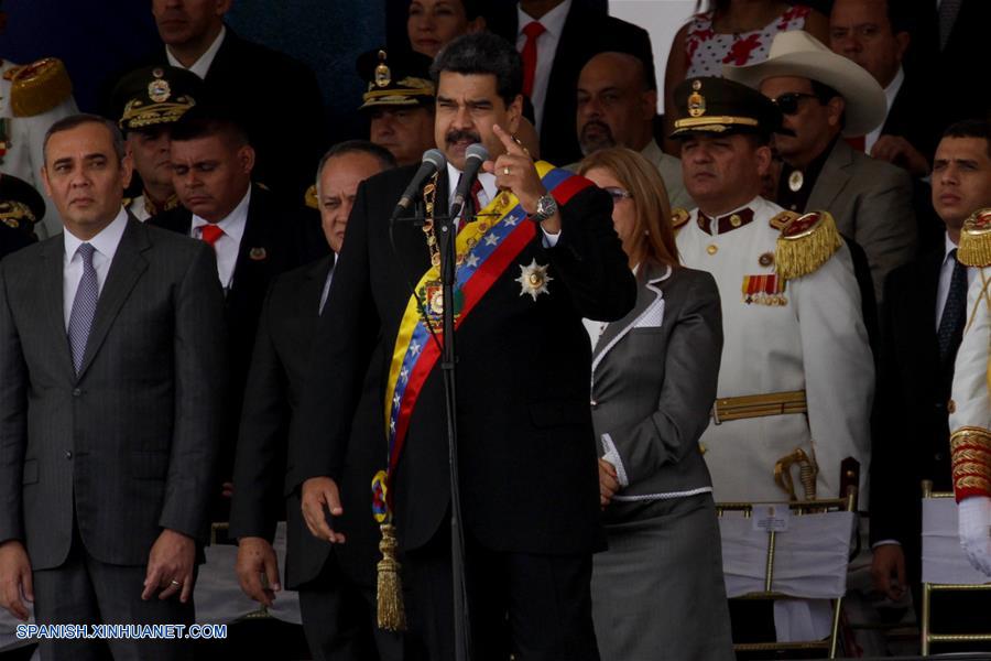 CARACAS, julio 5, 2018 (Xinhua) -- El presidente venezolano, Nicolás Maduro (c), pronuncia un discurso durante un desfile cívico-militar en conmemoración del 207 aniversario de la firma del Acta de Declaración de Independencia, en el Paseo Monumental Los Próceres, en Caracas, Venezuela, el 5 de julio de 2018. Venezuela celebra el jueves la conmemoración por el 207 aniversario de la firma del Acta de Declaración de Independencia. (Xinhua/Boris Vergara)