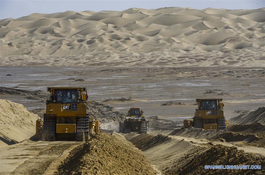 XINJIANG, julio 5, 2018 (Xinhua) -- Vehículos trabajan en el sitio de construcción de una carretera en el desierto de Taklimakan en la Región Autónoma Uygur de Xinjiang, en el noroeste de China, el 5 de julio de 2018. Una carretera de más de 300 kilómetros de largo, que enlaza al condado de Yuli de Xinjiang con el remoto condado de Qiemo, está bajo construcción en el desierto de Taklimakan. Es la tercera carretera de ese tipo que atraviesa el mayor desierto de China, Taklimakan, apodado "el Mar de la Muerte" en China. (Xinhua/Hu Huhu)