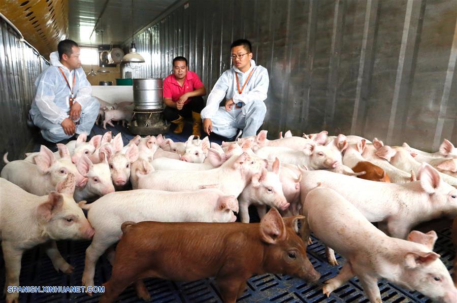 SHANDONG, julio 5, 2018 (Xinhua) -- El técnico, Wu Dezhuan (d), da instrucciones a los granjeros acerca de la crianza de cerdos en una base de demostración tecnológica de ganadería, en el distrito de Jimo de la ciudad de Qingdao, provincia de Shandong, en el este de China, el 5 de julio de 2018. Equipos de técnicos fueron creados en el distrito de Jimo para proporcionar consultas a familias afectadas por la pobreza, quienes enfrentan problemas cuando llevan a cabo proyectos personalizados de mitigación de la pobreza. Aproximadamente 700 familias han obtenido ayuda e incrementado sus ingresos. (Xinhua/Liang Xiaopeng)