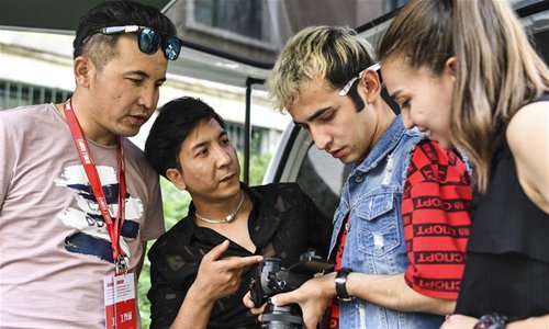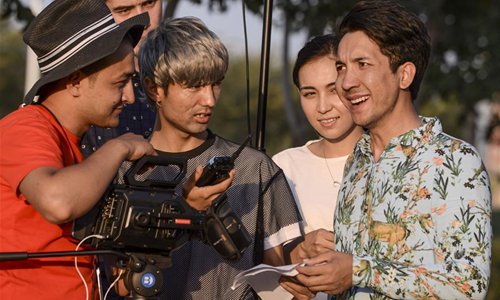 Urumqi, 06/07/2018(El Pueblo en Línea) -Daodao (segundo a la izquierda) revisa una toma con otros miembros del elenco artístico y el equipo técnico en Urumqi, Xinjiang, Región Autónoma de Uygur, 7 de junio del 2018. (Foto: Xinhua/ Wang Fei)