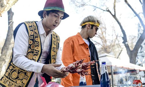 Urumqi, 06/07/2018(El Pueblo en Línea) -Daodao (a la izquierda) prepara carne asada al pincho durante la filmación de un vídeo musical en Urumqi, Xinjiang, Región Autónoma de Uygur, 7 de junio del 2018. (Foto: Xinhua/ Wang Fei)