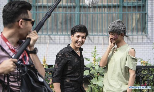 Urumqi, 06/07/2018(El Pueblo en Línea) -Daodao (primero a la derecha) y el director Hezreteli Yasin (segundo a la izquierda), quien también actúa en la comedia, discuten una escena en Urumqi, Xinjiang, Región Autónoma de Uygur, 7 de junio del 2018. (Foto: Xinhua/ Wang Fei)