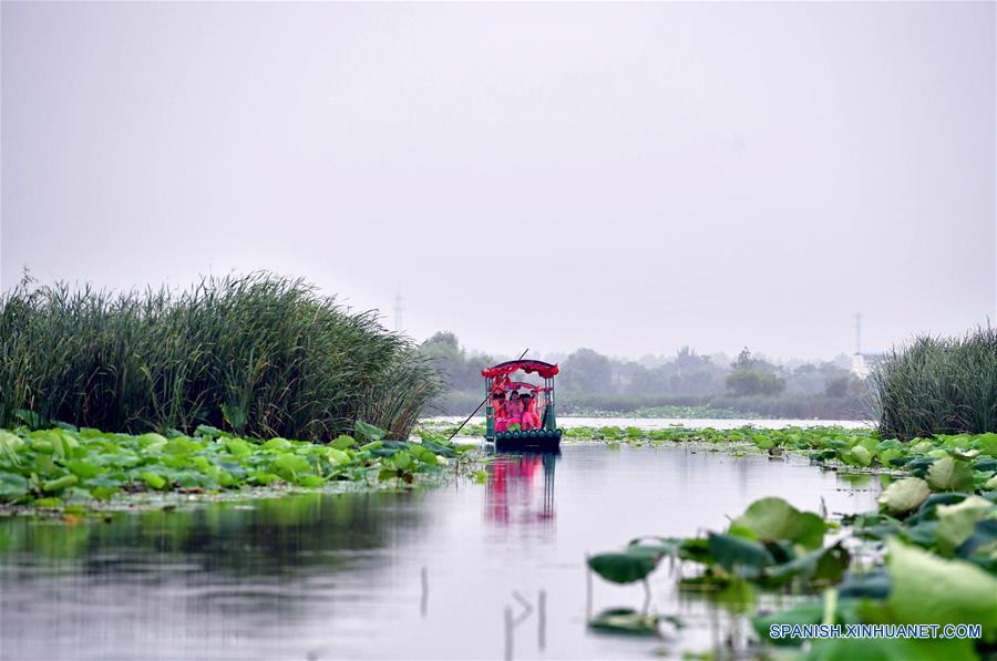 HENAN, julio 9, 2018 (Xinhua) -- Turistas observan flores de loto desde un bote en el Lago Longhu en el condado de Huaiyang, provincia de Henan, en el centro de China, el 9 de julio de 2018. (Xinhua/Feng Dapeng)