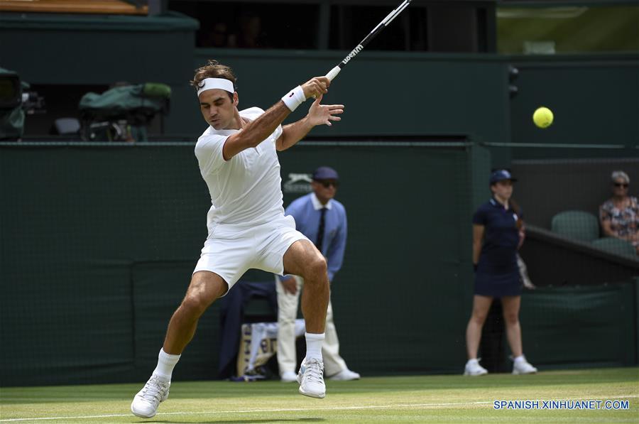 Roger Federer, de Suiza, devuelve la pelota a Adrian Mannarino, de Francia, durante un partido individual masculino de la cuarta ronda del Campeonato de Wimbledon 2018, en Londres, Reino Unido, el 9 de julio de 2018. (Xinhua/Stephen Chung)