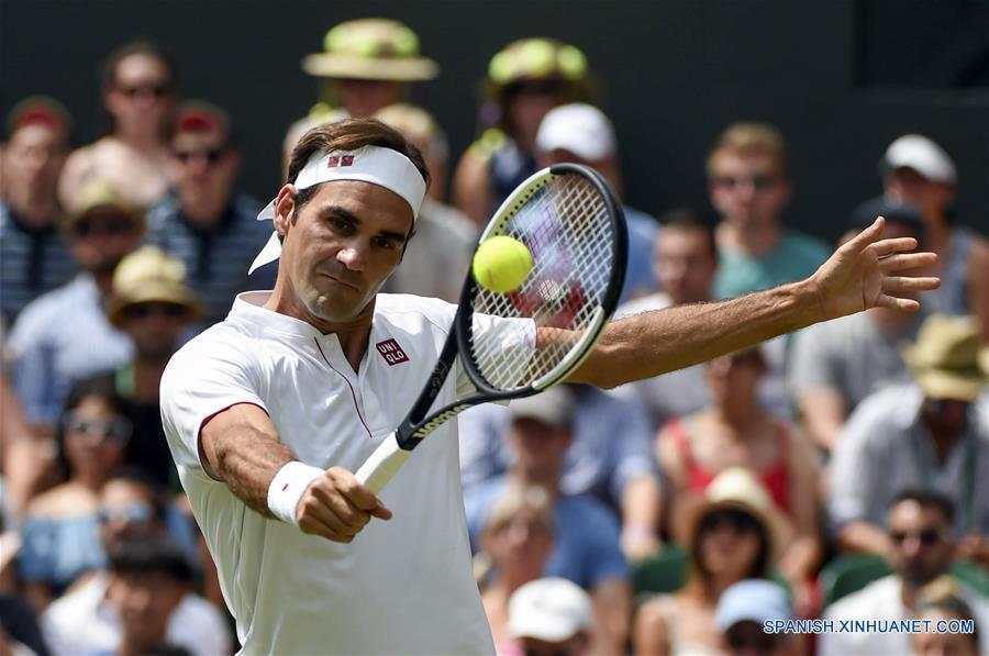 LONDRES, julio 9, 2018 (Xinhua) -- Roger Federer, de Suiza, devuelve la pelota a Adrian Mannarino, de Francia, durante un partido individual masculino de la cuarta ronda del Campeonato de Wimbledon 2018, en Londres, Reino Unido, el 9 de julio de 2018. (Xinhua/Stephen Chung)
