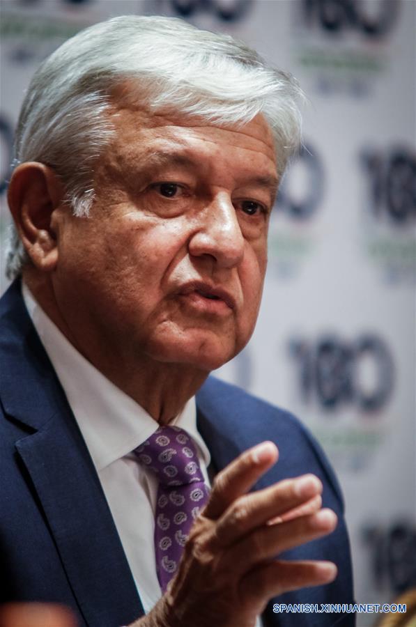 El virtual ganador de la elección presidencial en México, Andrés Manuel López Obrador, conversa con representantes de los medios de comunicación después de reunirse con empresarios e industriales de la Confederación de Cámaras Industriales (CONCAMIN), en la Ciudad de México, capital de México, el 9 de julio de 2018. De acuerdo con información de la prensa local, Andrés Manuel López Obrador se reunió el lunes a puerta cerrada en un hotel de Polanco con empresarios e industriales de la CONCAMIN para tratar temas de inversión. (Xinhua/Francisco Ca?edo)