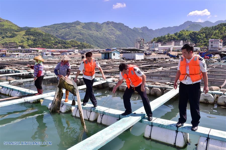 Empleados ayudan a los residentes en los trabajos de prevención mientras el tifón María, el octavo tifón del a?o, se aproxima a las costas chinas, en la villa de Cheng'ao de la localidad de Sanduao en la ciudad de Ningde, provincia de Fujian, en el sureste de China, el 10 de julio de 2018. (Xinhua/Lin Shanchuan)