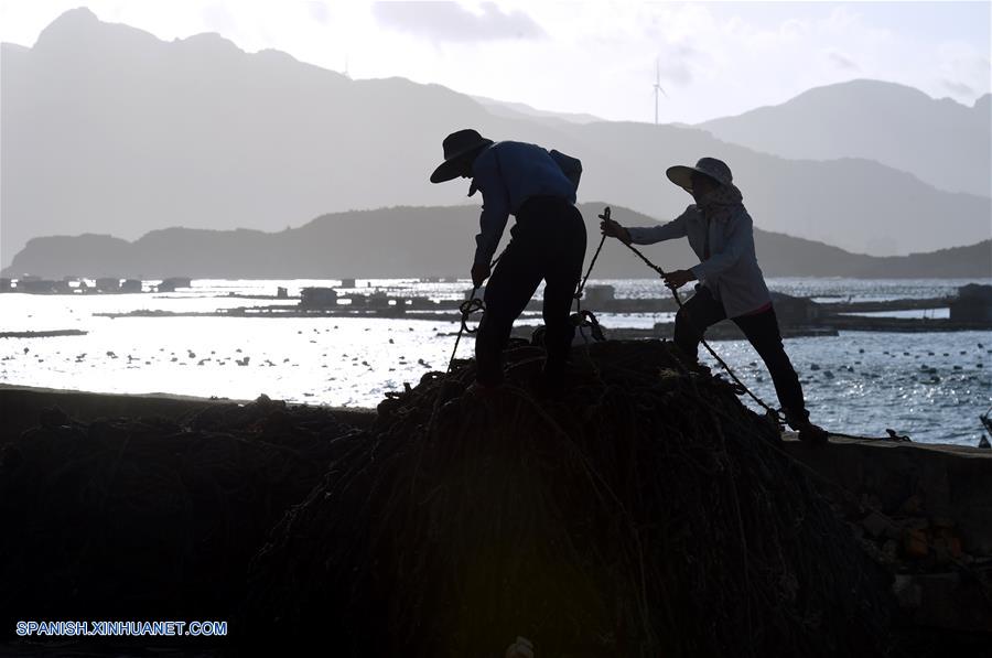 Pescadores refuerzan el aparejo de pesca la orilla mientras el tifón María, el octavo tifón del a?o, se aproxima a las costas chinas, en la villa de Houwan de la localidad de Tailu en el condado de Lianjiang, provincia de Fujian, en el sureste de China, el 10 de julio de 2018.(Xinhua/Jiang Kehong)