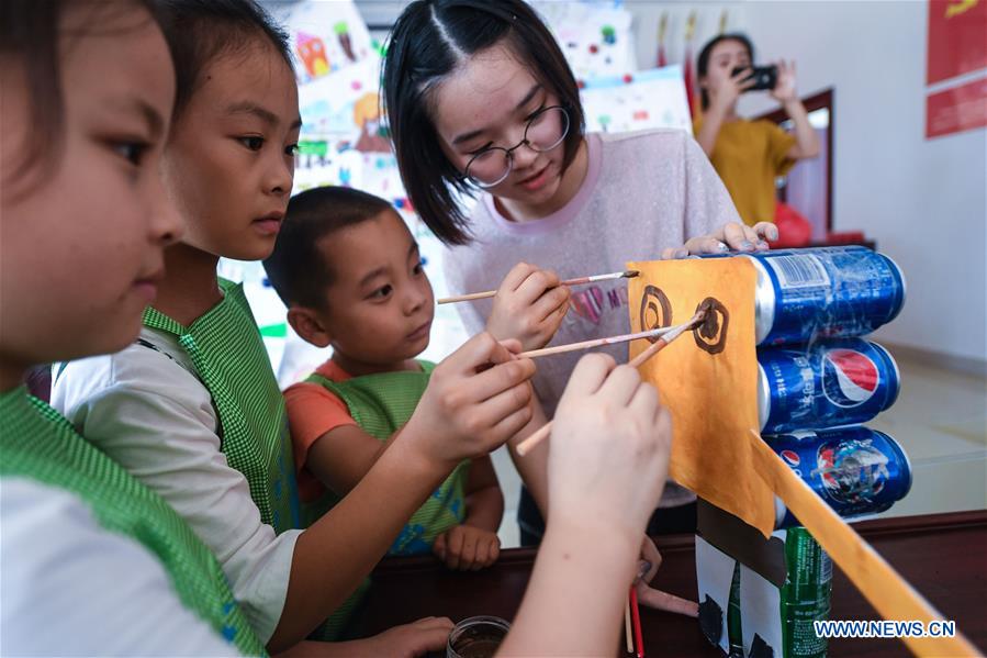 Los estudiantes aprenden a confeccionar adornos con materiales reciclados durante el taller impartido en una escuela del municipio Lincheng, Changxing, provincia de Zhejiang. Voluntarios de la Universidad Normal de Hangzhou y funcionarios del gobierno organizan talleres para ense?ar a los estudiantes a clasificar y reutilizar la basura. 10 de julio del 2018 (Foto: Xinhua/ Xu Yu)