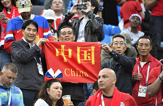 Los seguidores chinos del fútbol demuestran su fervor patriótico durante el partido entre Rusia y Egipto en San Peterburgo, Rusia, 19 de junio del 2018. [Foto: Xinhua]