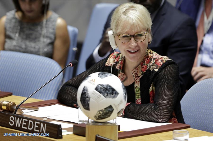 La ministra de Relaciones Exteriores de Suecia, Margot Wallstrom (frente), cuyo país tiene la presidencia del Consejo de Seguridad durante julio, preside una reunión del Consejo de Seguridad en la sede de la Organización de las Naciones Unidas (ONU), en Nueva York, Estados Unidos, el 10 de julio de 2018. De acuerdo con información de la prensa local, el Consejo de Seguridad discutirá levantar las sanciones en contra de Eritrea después de su acuerdo con Etiopía para finalizar su "estado de guerra", informaron diplomáticos el martes. (Xinhua/Li Muzi)