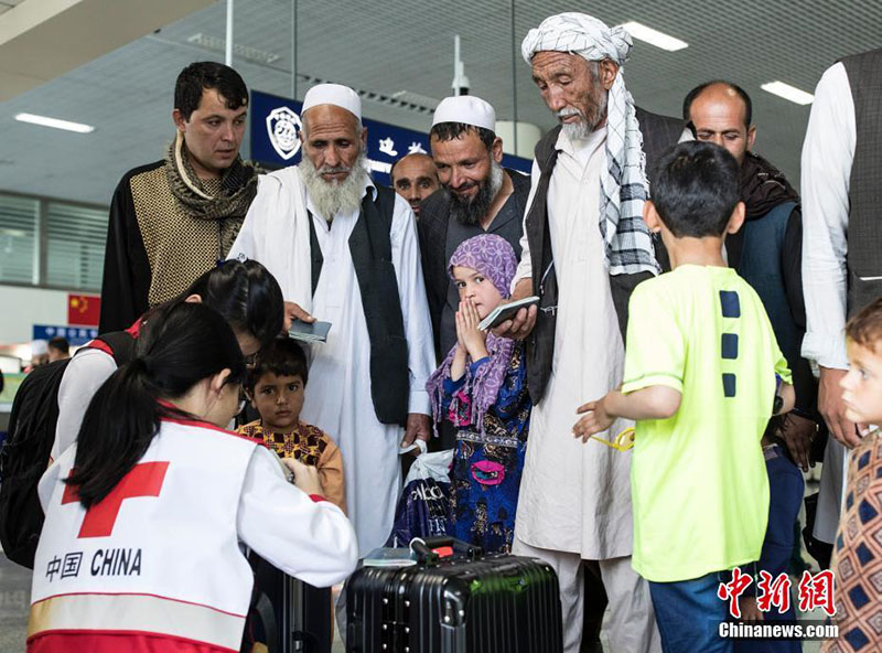 El personal de la Cruz Roja China ayuda a los pacientes afganos y sus familias a cumplir con las formalidades de ingreso en un aeropuerto de Xinjiang, el 4 de julio de 2018.