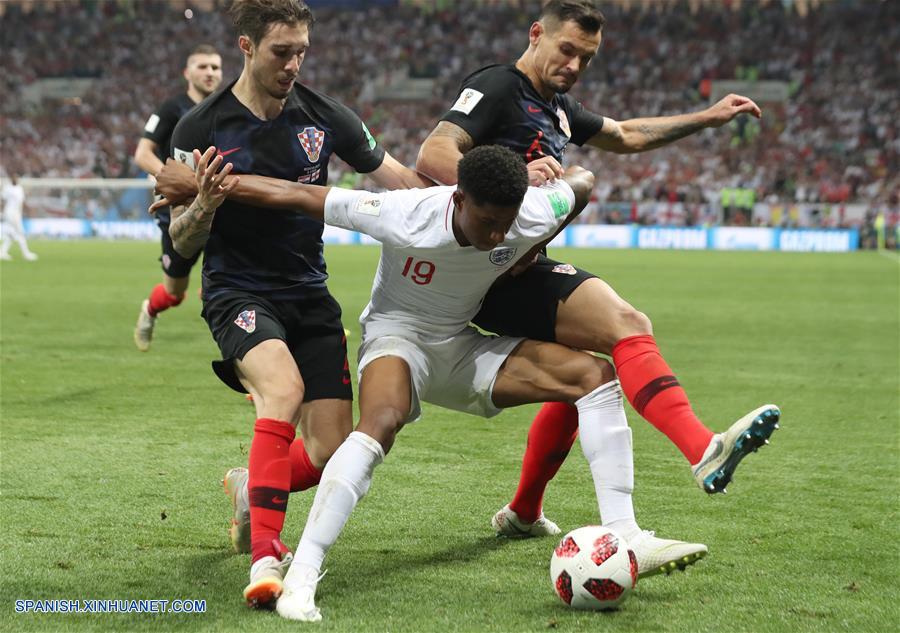 El jugador Marcus Rashford (c), de Inglaterra compite durante el partido de semifinal de la Copa Mundial de la FIFA Rusia 2018, ante Croacia, en Moscú, Rusia, el 11 de julio de 2018. (Xinhua/Cao Can)