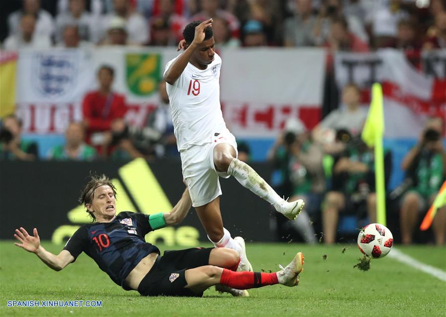 El jugador Luka Modric (i), de Croacia, disputa el balón con Marcus Rashford (d), de Inglaterra durante el partido de semifinal de la Copa Mundial de la FIFA Rusia 2018, en Moscú, Rusia, el 11 de julio de 2018. (Xinhua/Cao Can)