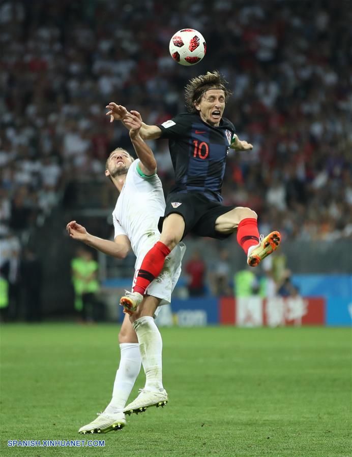 El jugador Luka Modric (i), de Croacia disputa el balón con Harry Kane (i), de Inglaterra durante el partido de semifinal de la Copa Mundial de la FIFA Rusia 2018, en Moscú, Rusia, el 11 de julio de 2018. (Xinhua/Wu Zhuang)