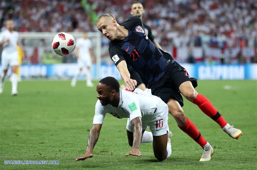 El jugador Domagoj Vida (d), de Croacia, disputa el balón con Raheem Sterling (abajo), de Inglaterra, durante el partido de semifinal de la Copa Mundial de la FIFA Rusia 2018, en Moscú, Rusia, el 11 de julio de 2018. (Xinhua/Wu Zhuang)