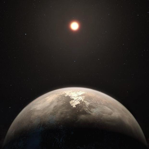 El planeta templado Ross 128 b, con su estrella madre enana roja de fondo - ESO / M. Kornmesser