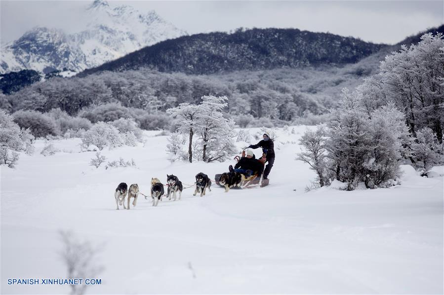 Imagen del 8 de julio de 2018, de turistas paseando en un trineo tirado por perros en el criadero "Siberianos de Fuego", en la ciudad de Ushuaia, provincia de Tierra del Fuego, Argentina. Los trineos tirados por perros, una actividad milenaria en regiones del hemisferio norte como Alaska, Escandinavia o Siberia, tienen presencia en el sur de Argentina, hasta donde llegan turistas atraídos por los simpáticos e imponentes huskies, raza canina que se caracteriza por su inagotable capacidad de correr. (Xinhua/Martín Zabala)
