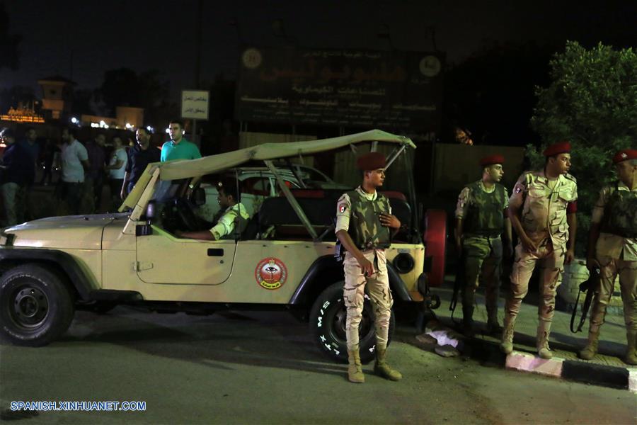 Fuerzas de seguridad vigilan frente a la compa?ía petroquímica donde dos depósitos explotaron, en El Cairo, Egipto, el 13 de julio de 2018. Doce personas resultaron heridas la noche del jueves por la explosión de unos depósitos de combustible cerca del Aeropuerto Internacional de El Cairo, Egipto, pero el tráfico aéreo no fue interrumpido. (Xinhua/Ahmed Gomaa)